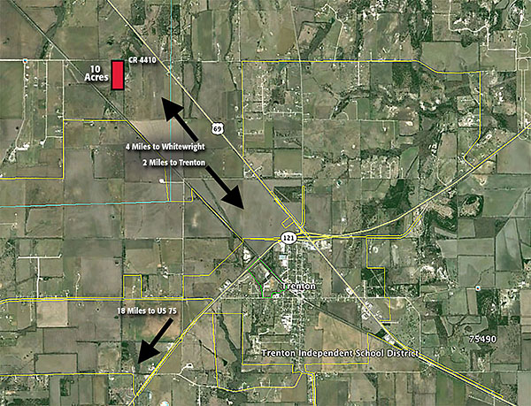 A heavily-treed 10 acre tract located on CR 4410 about .3 miles west of 69. Property is very secluded and would be perfect for someone looking for privacy when building their home. Property has approx. 375’ of all-weather road frontage on CR 4410. Located 18 miles north of US 75, 4 miles south of Whitewright and 2 miles north of Trenton.